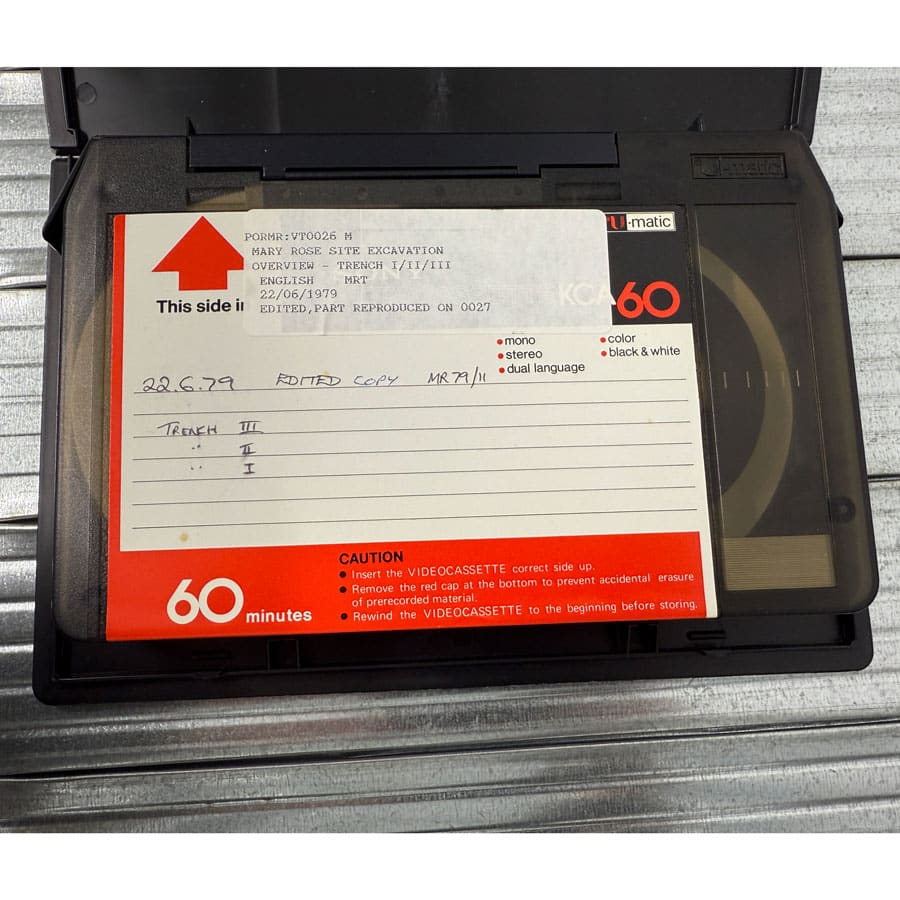Beginning in the 70’s, 16mm film reels, U-matic cassette tapes, and 5mm audio tapes were all used to various extents to capture aspects of diving, excavation, archaeological documentation, promotional footage, documentaries, radio shows, and the raising of the hull. Following this in the mid 80s, we see Betacam tapes, Super 8mm reels and some very retro looking Video Compact Cassettes (VCC). With the ship now raised, this footage is mostly promotional or documentary footage of the new museum, including interviews with the museum team.